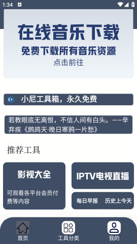 小尼助手是一款功能强大的免费工具软件,集追剧、听音乐、看电视直播于一体,为用户提供海量免费资源。它不仅支持手机端安装,还拥有清爽的界面设计和便捷的操作体验,让用户轻松享受影音娱乐。虽然受限于国家政策无法在电视上安装,但其全面的功能和纯净的使用环境依然让它成为日常生活中的得力助手。