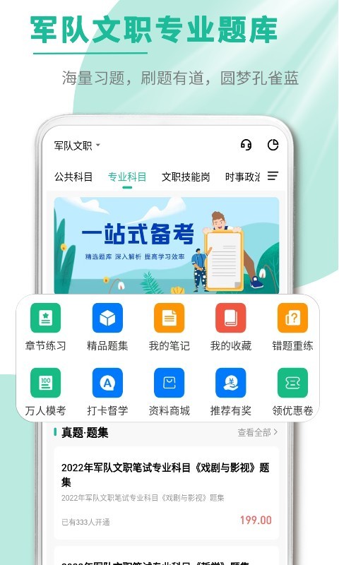 收录历年军队文职考试真题及权威模拟试卷,真实还原考试场景。用户可进行限时模拟测试,系统自动批改并生成详细分析报告,帮助考生精准把握考试重点和命题趋势。