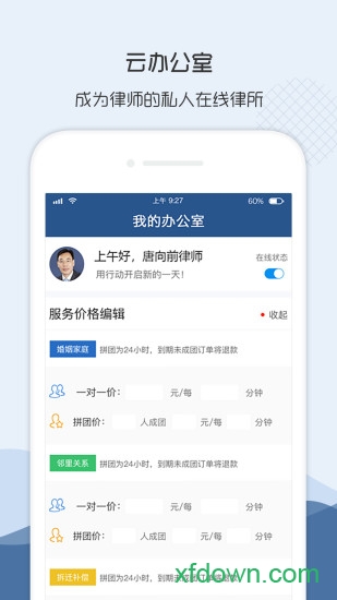 律鸽问律师端是专为律师打造的移动办公助手,它将传统法律服务搬上云端,让律师随时随地都能高效开展工作。通过这款应用,律师可以轻松管理线上接单案件,系统化整理潜在客户咨询记录,与客户保持实时沟通互动。同时支持自定义服务价格设置,分享经典案例提升个人品牌影响力。无论是案件管理还是业务拓展,律鸽问律师端都能提供智能化解决方案,帮助律师实现工作流程数字化,大幅提升工作效率和服务质量。现在就来体验这款让法律工作更便捷的移动办公神器吧。