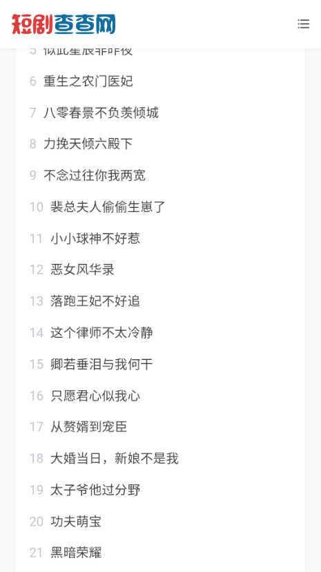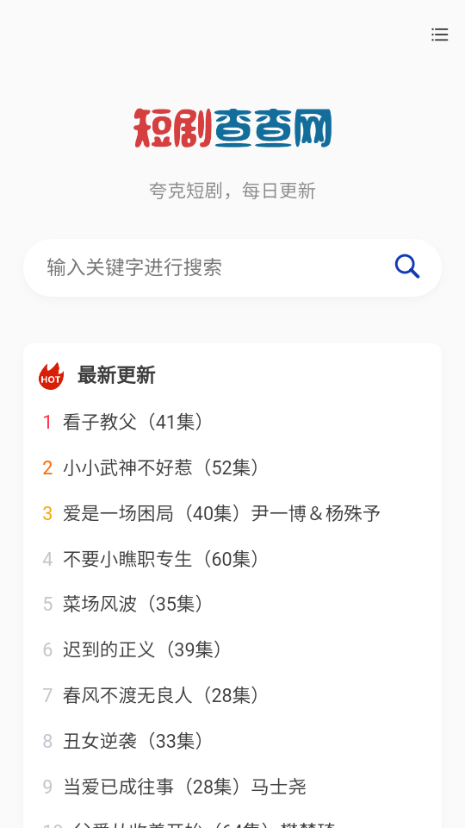 短剧查查网是一个专注于短剧资源推荐和观看的优质平台,为广大短剧爱好者提供丰富多样的内容选择。在这里,你可以轻松找到各种类型的精彩短剧,无论是都市情感、悬疑推理、古装玄幻还是青春励志,都能满足你的观影需求。平台每日实时更新热门短剧资源,让你随时掌握最新最火的短剧动态,打造极致的短剧观看体验。
