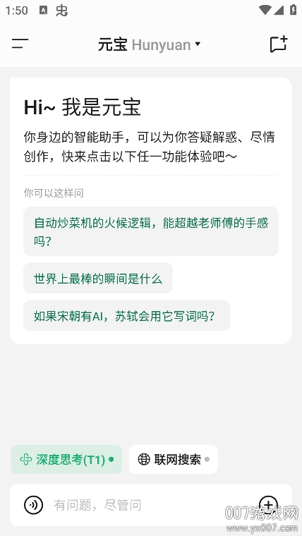 元宝手机app最新版(deepseekr1满血版上线)是一款功能强大的智能助手应用,由腾讯公司基于自研混元大模型打造而成。这款软件不仅支持深度搜索功能,还能为用户提供全方位的AI服务体验。用户只需在软件内输入问题或需求,系统就能快速给出精准解答或完成相应任务。软件集成了多种实用AI功能,包括AI修图、智能写作、语言陪练等,帮助用户高效处理日常工作生活中的各种需求。