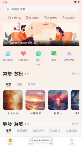 智能互动工具:提供职问快答、专业心理测评、场景冥想等多种实用功能,通过科学的方法帮助用户缓解职场压力,提升工作效率和生活质量。