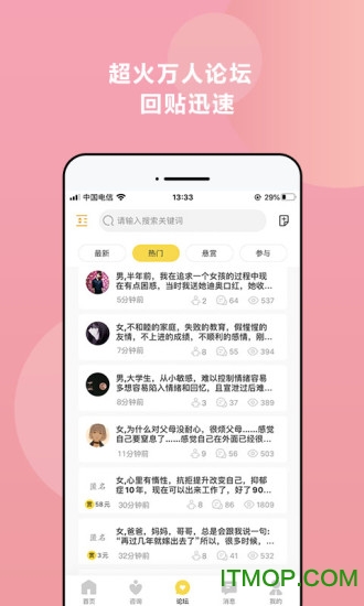 论坛可发布的话题:抑郁、焦虑、自卑、强迫、恐惧、婚姻修复、情感挽回、婆媳矛盾、出轨、自暴、自闭、厌学、网瘾、叛逆、情感管理、人格成长、情商提升、人生规划:论坛话题分类更加细化,方便用户找到相关讨论区。