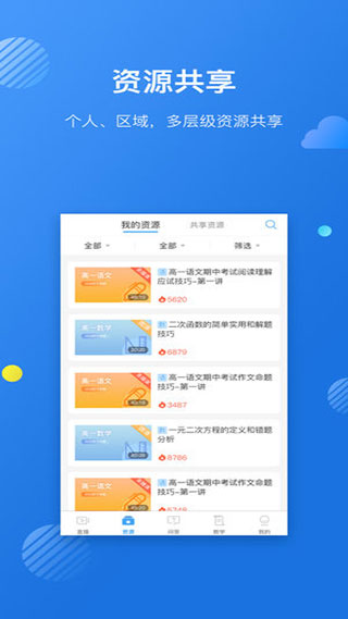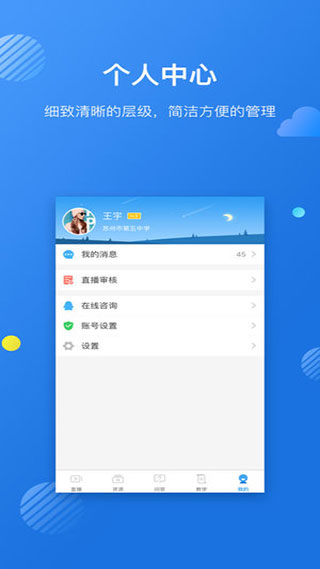 直播模块不仅展示直播推荐信息,还支持教师自主开播或观摩优质课堂;答疑模块集中管理学生提问,实现师生即时互动;学习模块整合课程资源与作业系统,支持教学全流程管理;资源模块提供丰富的学科类和特色类教学素材,包括视频、文档、测验题库等;个人中心则集成了消息通知、云存储、积分管理等实用工具,为教师提供全方位的教学支持。