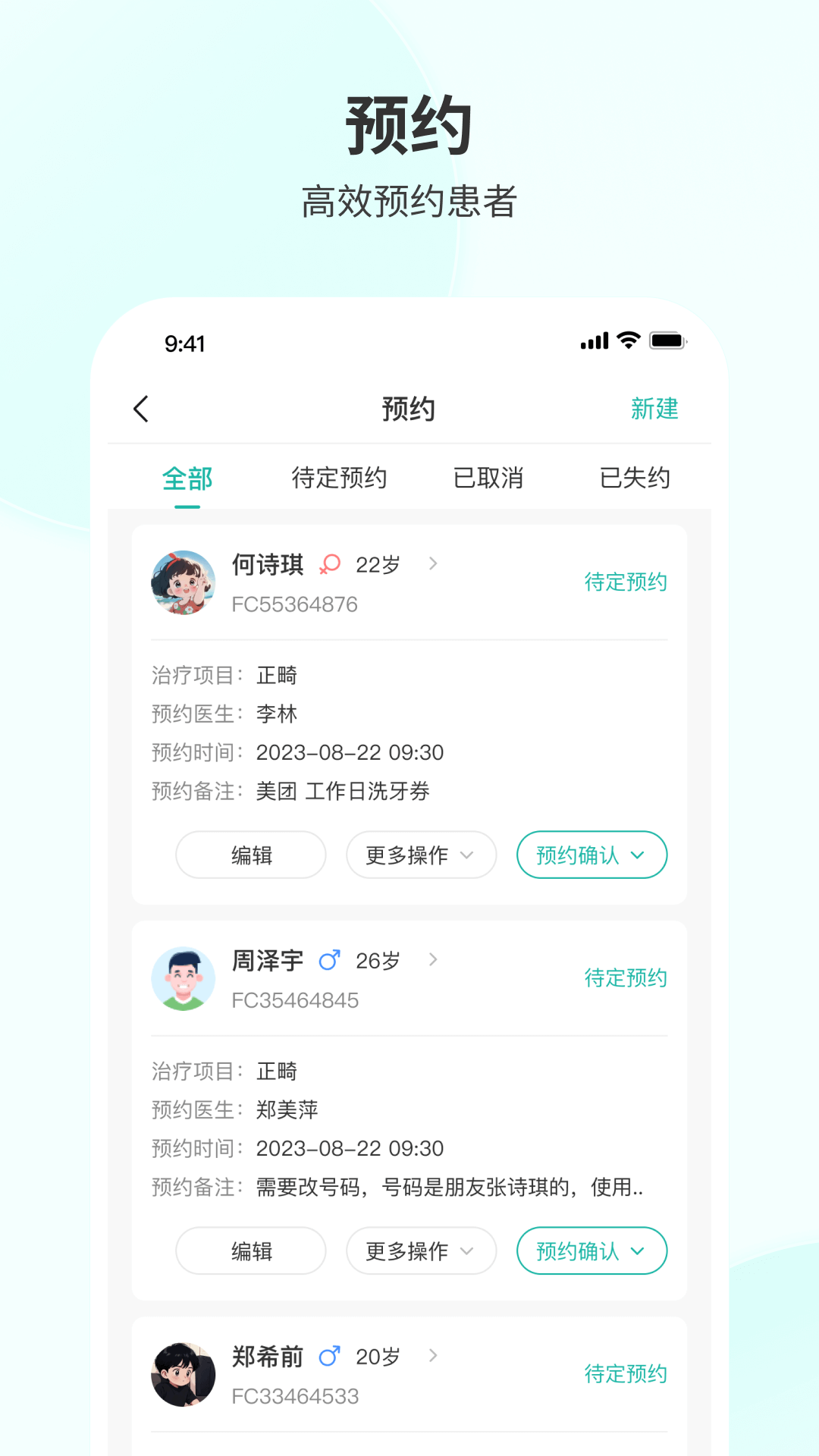 提供完整的患者预约、建档、影像、会员管理等基础功能,实现全面服务。智能排班系统可根据医生专长和患者需求自动分配就诊时段,减少等待时间。同时,患者可通过手机端随时查看预约状态和就诊提醒,享受更加便捷的就医体验。