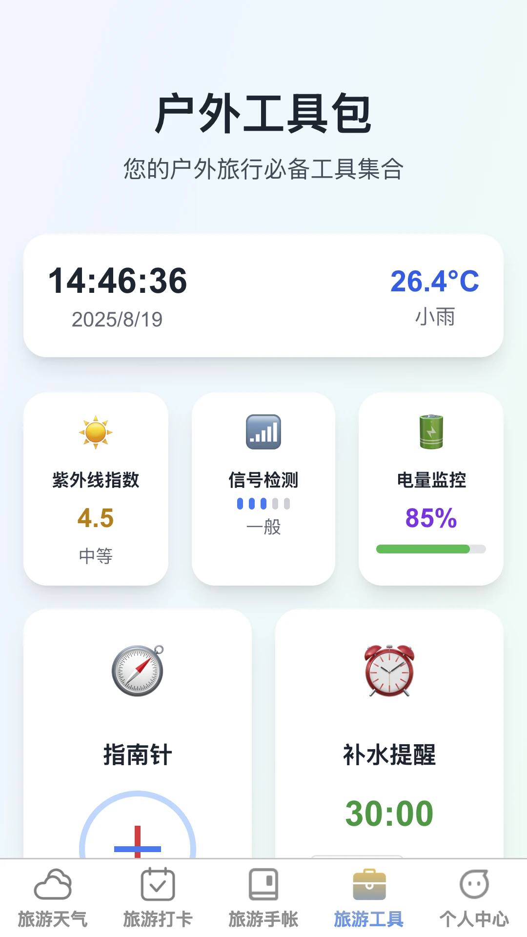 旅游工具包内置指南针、喝水提醒和应急呼叫等实用功能,即使在无网络环境下也能正常使用。