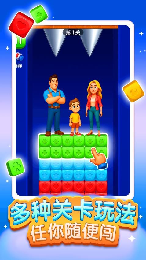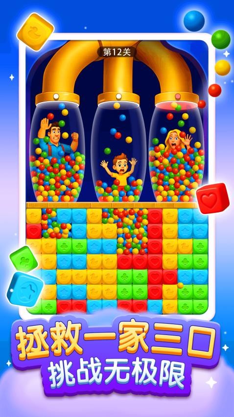 游戏的核心玩法是通过消除相同的星星方块来清除障碍物并激活逃生通道。所有机关陷阱都可以通过消除的方式解除,这种直观的机制让玩家能够快速上手。游戏中会出现各种动态的危险元素,如滚落的球体和下压的锯齿等,玩家需要在通道激活前确保一家三口的安全。
