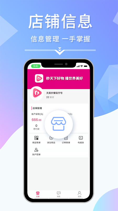 天美秒播商家版app是一款专为商家量身打造的高效经营工具,让开店变得前所未有的简单。通过这款应用,商家可以零成本、零门槛快速入驻平台,轻松开启线上业务。商品管理功能让上架产品变得轻而易举,店铺信息一手掌控,消息必答功能确保您能第一时间响应顾客需求,不错过任何商机。无论是新手商家还是经验丰富的经营者,都能通过天美秒播商家版实现业务的快速增长和高效管理。