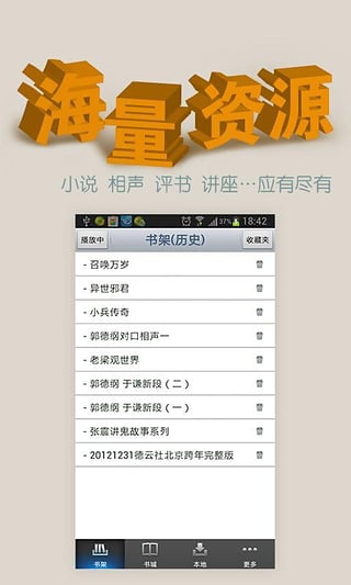 播放控制功能更加完善,新增通知栏播放控制面板,让你在手机锁屏状态下也能轻松操作。桌面Widget控件让听书变得更加便捷,一键即可开启你的听书时光。