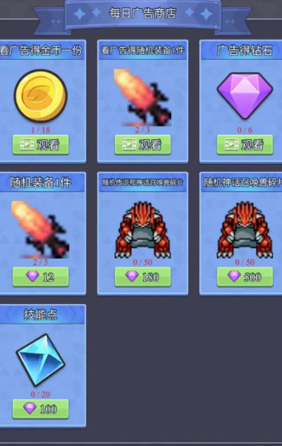 开局可以先看和钻石购买,六件装备,这是初期快速提升战力的有效方式。打怪掉落先别想了,需要“能力”升级,只有战力足够才能解锁更高品质的装备掉落。前面的英雄等级不用升太高,留资源后面开英雄,避免前期资源浪费。资源主要来源依旧是广告,左上角的“宝箱”是获取额外奖励的重要途径,记得定期领取。此外,参与游戏内的限时活动也能获得稀有装备和材料。