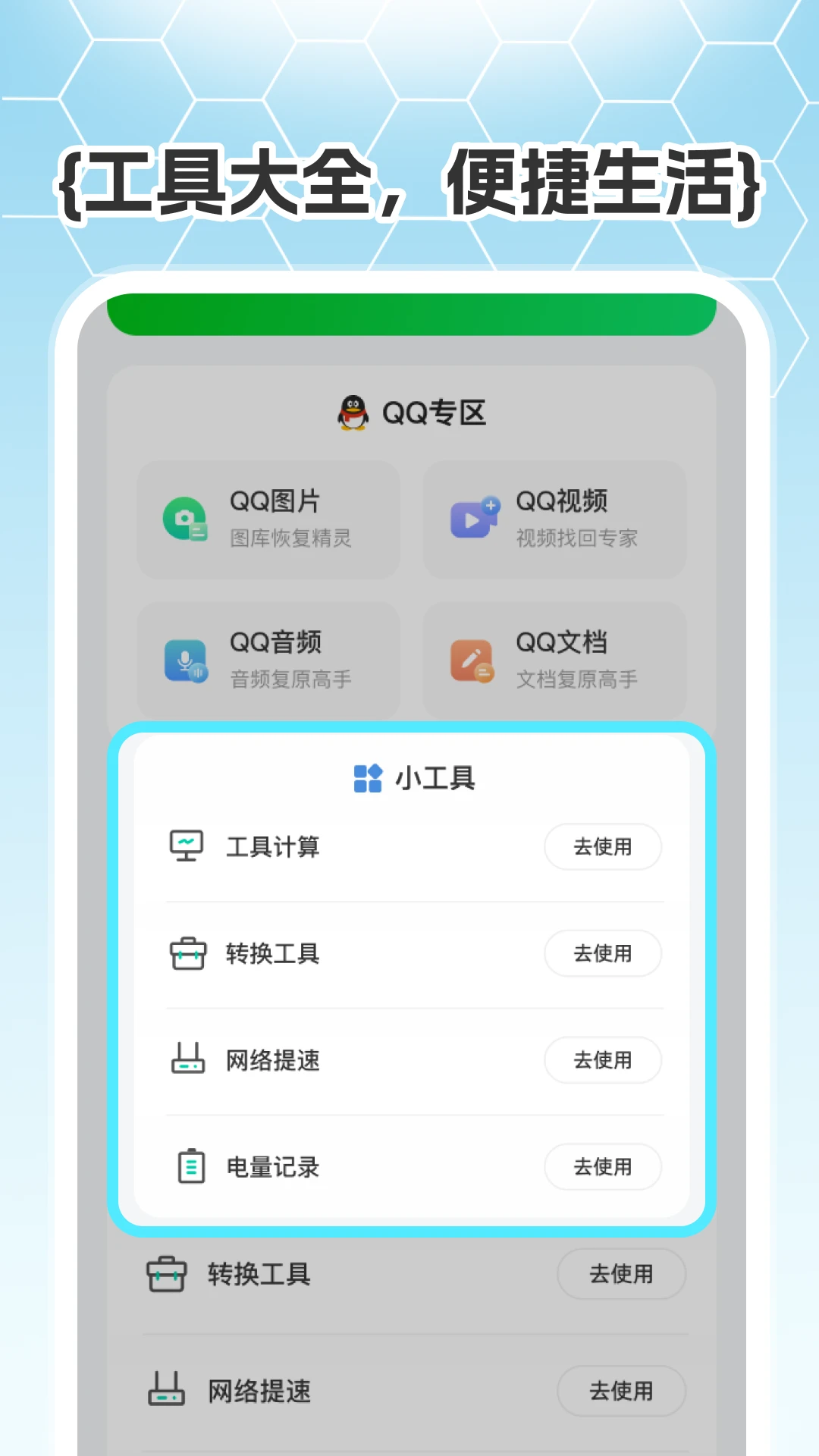 数据修复专家是一款全方位的数据恢复与管理应用,专为解决您的数据丢失烦恼而设计。无论是不慎删除的微信聊天记录、QQ中的珍贵图片视频,还是本机上的重要文档音频,我们都能提供一键恢复服务,让您的数据失而复得。此外,我们集成了强大的工具大全,涵盖日常所需的计算器、单位转换、网络提速、电量监控等功能,让您轻松应对各种生活与办公场景。更有手机测速功能,实时监测手机性能,助您时刻保持设备良好状态。数据修复专家,您的私人数据守护者,让数据安全无忧!