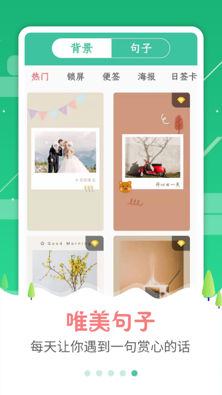 海量背景图库任你选择,软件提供超过1000种精美背景模板,包括锁屏壁纸、封面设计、宣传海报、少女风格、纯色背景、渐变色背景等多种类型。您还可以上传自己的照片作为背景,进行个性化编辑创作。