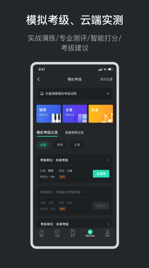 完整的考级模拟系统,包含各大音乐考级机构的考试曲目和评分标准,帮助用户在正式考试前充分准备,提升通过率。