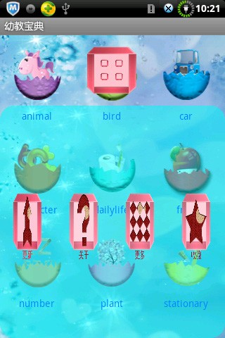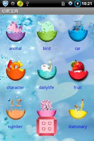 软件采用简洁明了的九宫格主界面设计,分类明确,操作简单,即使是幼儿也能轻松上手。每个分类都配有色彩鲜艳、形象生动的图片,如可爱的动物、漂亮的水果等,吸引孩子的注意力。界面布局经过专业设计,按钮大小适中,避免误操作,确保孩子能够独立使用。整体风格活泼有趣,符合儿童审美,让孩子在愉快的氛围中学习。所有功能按钮都配有清晰的图标和文字说明,方便家长指导孩子使用。