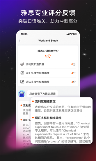 【即时评估】我们的智能评估系统会对您的每次练习进行多维度分析,包括流利度、连贯性、词汇运用、语法准确性和发音标准度等。系统不仅会指出问题所在,还会提供具体的改进建议和参考答案,帮助您快速提升口语水平。通过反复练习和即时反馈,您将逐步掌握高分回答技巧。