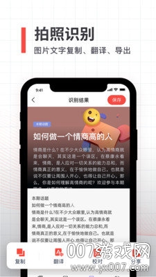 这款应用能够轻松扫描各种文字信息,无论是纸质文件、书籍还是图片,都能快速识别并提取文字内容。用户可以将识别后的文字保存到本地,或直接分享给他人,操作简单高效。同时,它还支持多种格式的转换,精准满足不同用户的需求。无论是调整图像参数、裁边处理,还是即时翻译,它都能提供出色的体验。