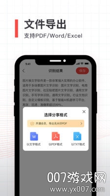 【分享导出】识别后的文字可以轻松分享给好友,支持多种格式导出,包括图片、PDF、ZIP、Word、TXT、Excel等,满足不同场景的需求。
