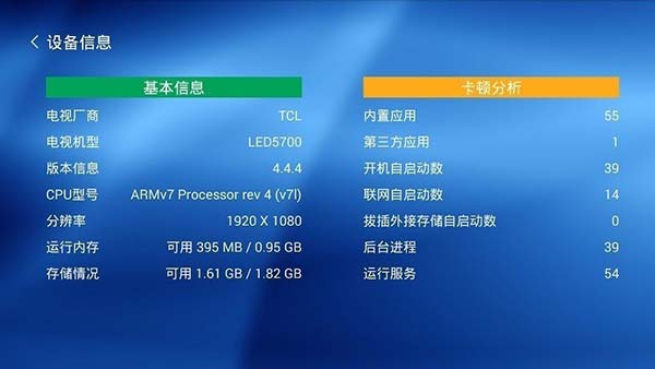 性能检测功能:一键扫描即可获取智能电视的详细硬件信息,包括机型、CPU型号、系统版本等关键数据,还能检测开机自启动软件数量,帮助您全面了解设备状态。