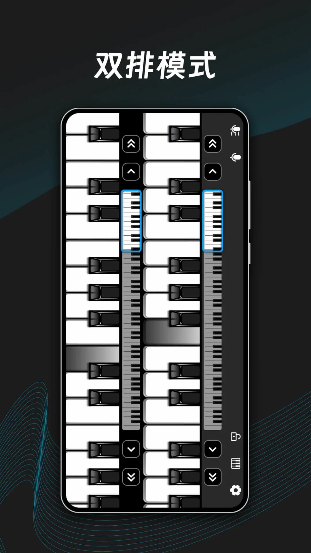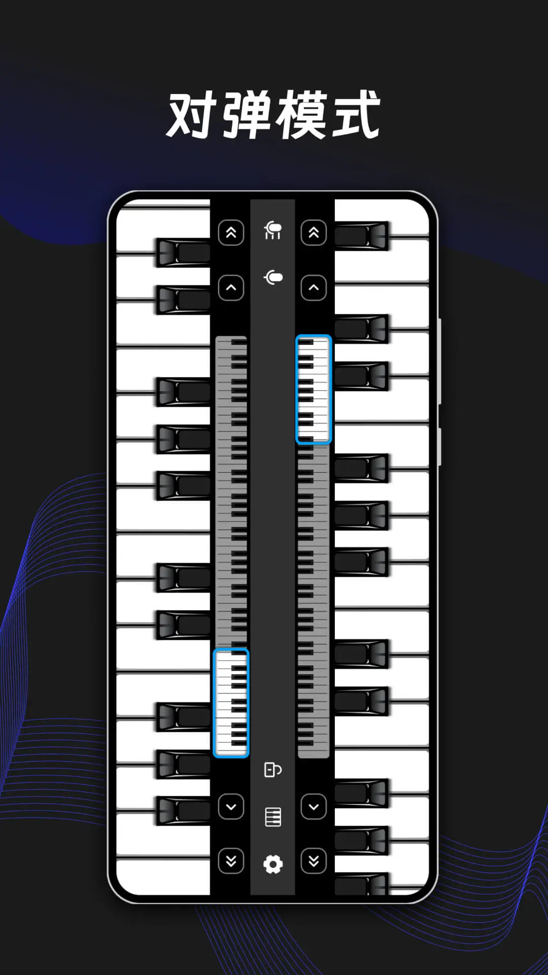 电子钢琴能把你的手机变成一个钢琴教练,帮您练琴弹琴,练钢琴节奏,了解钢琴,点击钢琴键盘的左右两边可随时调节钢琴块的范围显示完整。同时支持录音功能,你可以一边弹奏一边录制自己的歌曲,多种钢琴键盘模式:单排横屏模式、双排横屏模式。