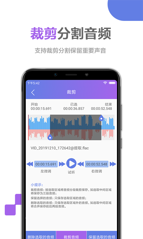 音频处理大师是一款功能强大且简单易用的手机音频处理工具,专为音乐爱好者、视频创作者和日常用户设计。无论您是想从视频中提取背景音乐,还是需要对录音进行精细剪辑,这款应用都能完美满足您的需求。其直观的操作界面让音频处理变得前所未有的轻松,即使是新手也能快速上手。现在就加入数百万用户的大家庭,立即下载体验这款改变您音频处理方式的革命性应用吧!